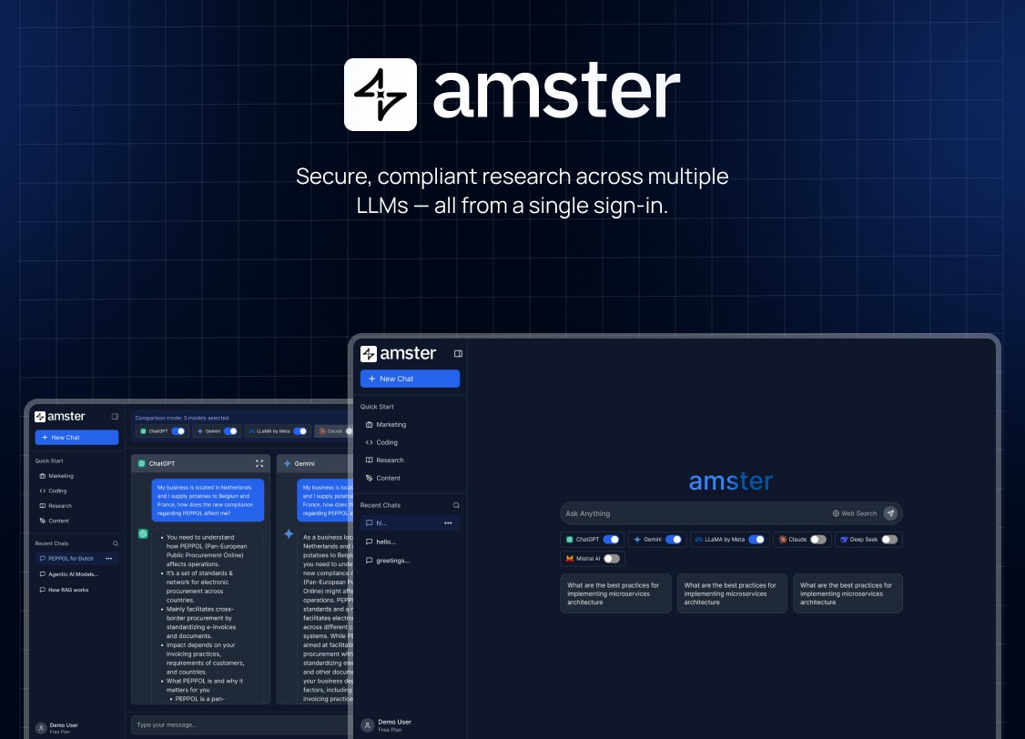 amster brengt de toonaangevende AI-modellen samen in één veilig, uniform platform, waardoor het gedoe van jongleren met tools, abonnementen en logins wordt weggenomen. Gebouwd voor ondernemingen, helpt het teams productief te blijven, kosten te verlagen en gevoelige gegevens met vertrouwen te beschermen.